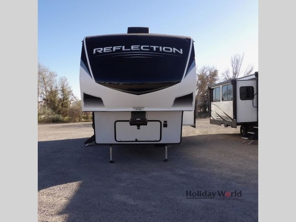 With any Reflection fifth wheels by Grand Design, you will have a 165W solar panel for off-grid camping and a 50 Amp charge controller and inverter prep, a Max Turn radius front cap for easy towing around town and into your campsite, a Universal All-In-One Docking Station, unobstructed pass-through storage, and Goodyear E-rated tires. Some other top features include a chef's kitchen with a 30" stainless steel microwave and residential cooktop, a USB charging station, and the ductless "Evenflow" heating system with no vents in the floor to collect debris. Each is constructed of high gloss gel coat exterior sidewalls, residential 5" truss rafters, walk-on roof decking, a fiberglass and radiant foil roof and front cap insulation plus laminated aluminum framed side walls, rear wall, roof and end walls in slide rooms. Choose luxury, value and towability over all the others, take home a Reflection of your good taste!