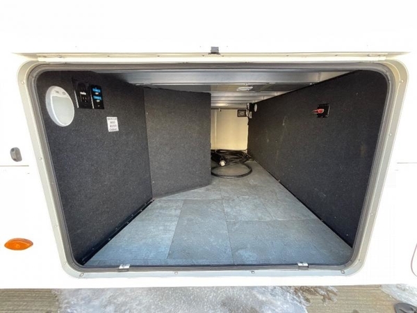 You and your spouse will love living in this fifth wheel with the master suite offering a walk-around queen bed with a king bed option, plus there is a 32" LED TV, and a slide out with a mirrored wardrobe and drawers plus a bathroom sink that stretches into the double-entry bathroom. The main living and kitchen area is spacious as well with two slides opening up the area around the kitchen island giving the cook plenty of space to make meals and you can relax on the theater seats, or the tri-fold sofa which offers sleeping space for guests. You can work or dine from the free-standing dinette while watching the LED Smart TV with fireplace below. And the oversized pantry as well as the hutch offers more storage for the food and picture frames. You might like to add a washer/dryer option if you don't want to use the appliances at the RV park, and there is a solar package option available.