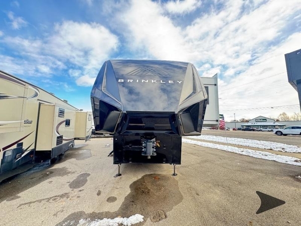 With any Model G toy hauler fifth wheel by Brinkley you will enjoy luxurious amenities, tons of storage space, and innovative features that have been developed and tested in the real world. Durable construction includes an industry leading PDI process, an industry best insulation package, and reinforced and walkable slide roofs. Some of the exterior features you'll find are a 3-way pass-through with a multi-functional flip-up bulkhead wall, under I-beam storage, a MAX-Vision reverse lighting system, and a low-maintenance roof to name a few. A Rockford Fosgate audio system comes standard, along with a OneControl app system that lets you control your fifth wheel's functions right from your mobile device. You will find the solar system with a designated storage area to be ultra convenient, plus there is a FlexPower 5500 with a dual fuel inverter generator for all your power needs. Head inside to find a residential interior with Brinkley's CraftSense wood trim construction, floating entrance steps, integrated window screens and insulated blackout blinds, and residential solid surface countertops plus backsplash. You will also enjoy the neon shower lighting and recessed medicine cabinets in the bath, plus motion activated LED bed lights and dual bedside outlets in the bedroom. Choose a Model G toy hauler fifth wheel to experience all the luxury it has to offer!