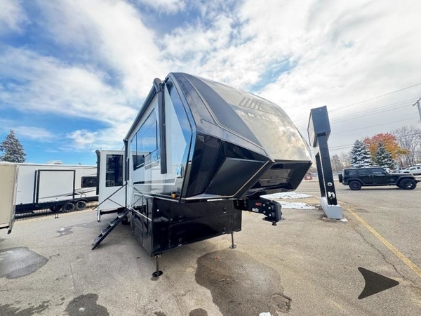 This toy hauler may just be the one you've been looking for! The garage/flex space with fold-away half bath walls will allow you to utilize the garage how you need it, plus there is an adjustable tie-down system, independent dual sofas, plus a loft for storage and a twin bed to sleep more campers! The garage patio with a 1,500 lb. capacity is another feature you are sure to love, especially with its own awning to keep you protected from the elements. Head to the kitchen to prepare meals with a 24" GE oven with a four burner range, a GE microwave with an air fryer, plus a spacious GE Energy Star 19 cu. ft. refrigerator. The island with two stools will let others visit with you while you cook, and there are even hidden dog bowls. You'll find the convertible dining table/L-desk will be accommodating since it can be use to dine at, and to get some work done. You may just find yourselves spending most of your time on the U-sofa in front of the TV and fireplace. A full bath is up front by the bedroom, and here you'll find neon shower lighting, a residential shower system, and pull-out linen storage to keep towels ready to use. After a day outdoors you'll love nothing more than coming back to your own bedroom with a king bed slide out, TV, a walk-in closet, and many more storage spaces. And we haven't even touched on the exterior features, like the 3-way pass-through storage, three power awnings, an air compressor to fill up tires, and the list goes on and on! This is a pre-production preview, all features and layout placement subject to change.