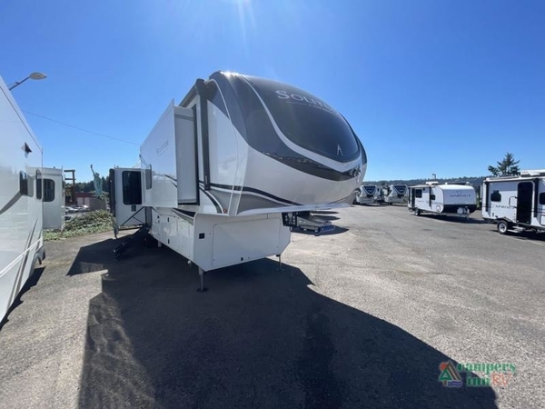 Each Solitude fifth wheel by Grand Design features a 101" wide-body construction, heavy duty 8,000 lb. axles, frameless tinted windows, and high-gloss gel coat sidewalls. You can camp year around thanks to the Weather-Tek Package that includes a 35K BTU high-capacity furnace, an all-in-one enclosed and heated utility center, and a fully enclosed underbelly with heated tanks and storage. Inside, you'll love the premium roller shades, hardwood cabinet doors, solid surface countertops, plus residential finishes throughout to make you truly feel at home. Each model also includes a MORryde CRE3000 suspension system, self adjusting brakes, and a MORryde pin box that will provide smooth towing from home to campground. Affordable luxury is possible with the Solitude fifth wheels; choose yours today!