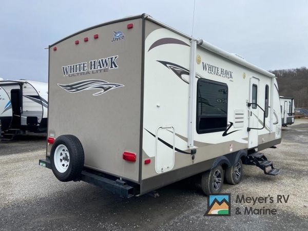 The White Hawk 24RBS travel trailer by Jayco offers a rear bath with a single slide.