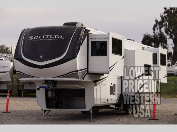 Each Solitude fifth wheel by Grand Design features a 101" wide-body construction, heavy duty 8,000 lb. axles, frameless tinted windows, and high-gloss gel coat sidewalls. You can camp during harsh weather thanks to the Weather-Tek Package that includes a 35K BTU high-capacity furnace, an all-in-one enclosed and heated utility center, and a fully enclosed underbelly with heated tanks and storage. Inside, you'll love the premium roller shades, hardwood cabinet doors, solid surface countertops, plus residential finishes throughout to make you truly feel at home. Each model also includes a MORryde CRE3000 suspension system, and a MORryde pin box that will provide smooth towing from home to campground. Affordable luxury is possible with the Solitude fifth wheels; choose yours today!
