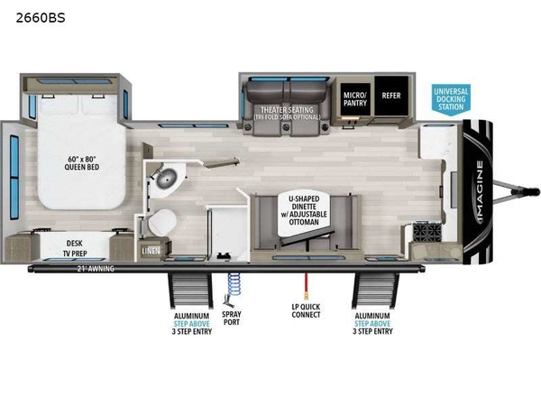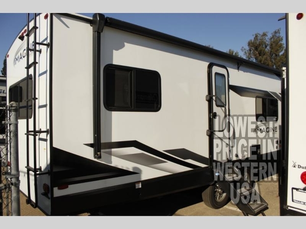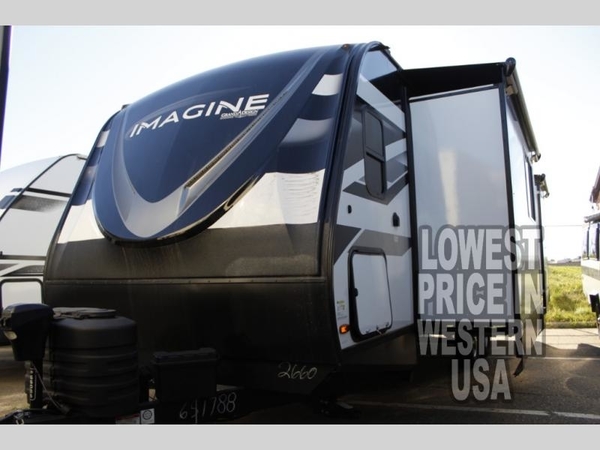 Just imagine leaving the world behind and secluding yourself away with your favorite people in your Grand Design Imagine travel trailer! The Imagine has been designed to enjoy extended season camping and includes a high-capacity furnace, a heated and enclosed underbelly with suspended tanks, a designated heat duct to the subfloor, and a high-density roof insulation with attic vent. You'll have maximum headroom with radius interior ceilings, and large panoramic windows to let in natural lighting. The exclusive drop-frame pass-through storage compartment is going to allow you to bring along lots of equipment, and the universal docking station is an all-in-one location for utilities and hook-ups. You'll also have industry-leading tank capacities so that you can fill and empty your tanks less often.