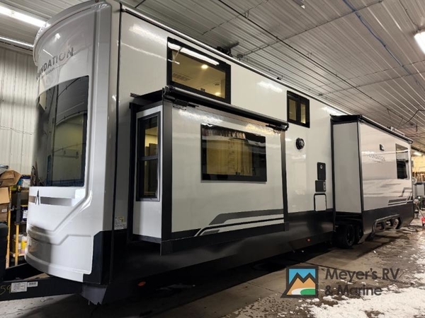 With any Foundation destination trailer by Grand Design, you can choose to stay longer surrounded by residential inspired features! The durable construction includes aluminum framing with a temperature-controlled fiberglass laminated wall, composite exterior decking with waterproof woven vinyl flooring, quad seal protection, and an industry-leading maintenance-less one-piece roof with composite roof decking panels. There is also an exterior convenience center, brass plumbing fittings, an 8' 5" wide body frame, and sleek bonded square glass windows. The interior is packed with residential features, including GE appliances, motorized shades in the living room and kitchen, solid surface countertops in the kitchen and bath, and the list goes on!