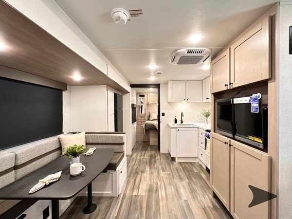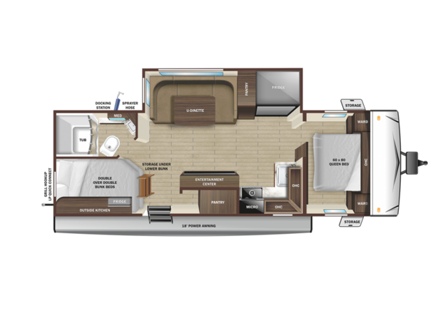 The whole gang can camp together in this travel trailer! Everyone will have a comfortable place to sleep between the rear corner set of double-size bunk beds, the queen bed inside the front private bedroom, and even the U-shaped dinette once converted. Behind the entertainment center there is a closet for your storage needs and the kitchen pantry is big enough to store everyone's favorite snacks. The chef will enjoy cooking with the three burner cooktop and 17" oven inside but enjoy cooking at the outside kitchen even more!