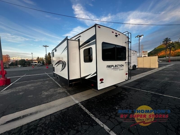 The tri-fold sofa on this Reflection 150 Series fifth wheel not only offers seating space, but it also offers extra sleeping space for the kids, grandkids, or friends. The main living area is quite spacious with two opposing slides, and this gives you more space around the kitchen island to prepare and serve meals. You will also find the hutch to be useful for storing your dishes, and the fireplace is nearby creating a great space to unwind in at night using the massage features on the theatre seats. You will find storage throughout the interior and along the exterior in the unobstructed pass-through compartment.