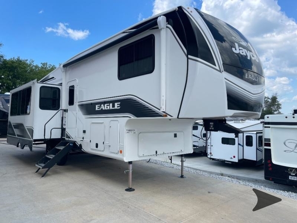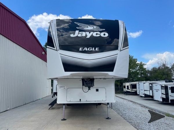 With any Eagle HT fifth wheel or travel trailer by Jayco you will enjoy a smooth drive thanks to the 4 Star Handling Package and MORryde CRE-3000 rubberized suspension. The Customer Value Package includes amenities that are sure to make camping easier than ever, like the 60K on-demand water heater, Keyed-Alike lock system, 15,000 BTU "Whisper Quiet" A/C, and more. Handcrafted door/drawer fronts will make your space feel more like home, along with residential vinyl flooring throughout, GE appliances, and blackout roller shades with reflective side throughout to keep the sun out when you want to sleep in. Each model also includes a NuVo H2O water treatment system with filters included, interior and exterior "Blue Sync" audio connect with MB Quart Sound for your TV and phone, and 100% no floor vents for added comfort and convenience!