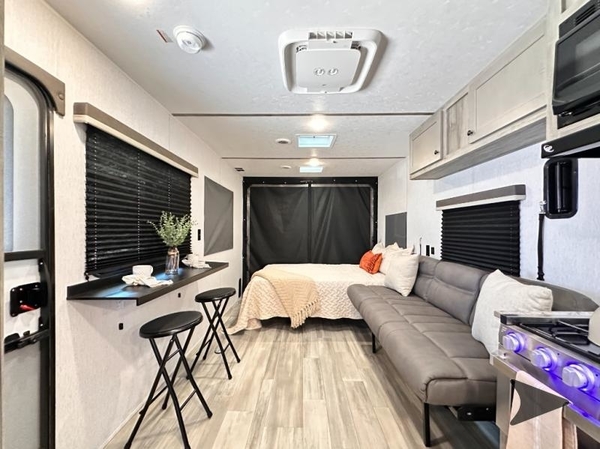 The Go Lite Mountainback provides impressive space. The fold-up Murphy bed and couch expand the interior, creating a roomy and comfortable environment. Keep the back ramp door open with the magnetic screen in place to let in a refreshing breeze and stay connected to nature.