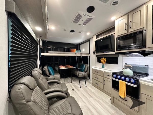 Are you looking for adventure and fun? The Momentum G-Class toy hauler by Grand Design will help you find it! You can explore during any season you choose with the Insulation Package that includes a heated and enclosed underbelly with suspended tanks, a high-capacity furnace, a moisture barrier floor enclosure, and cabinet-mounted heat ducts. Each model includes a fuel station with an interior and exterior gauge, a dovetail rear rend, and 2,500-LB tie-downs anchored into the chassis. Throughout the Momentum G-Class interior, you'll enjoy many comfortable features like large panoramic windows, a shower skylight, USB chargers in the bedroom, and residential cabinetry.