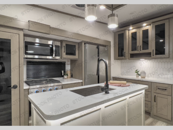 You can enjoy a spacious rear living area in this RV with dual opposing slides offering you entertainment, kitchen amenities, seating and windows for great views! The rear tri-fold sofa also converts into extra sleeping space for an extra guest or two, just like the booth dinette does. Yet you might like to add the swivel dinette option. There are theater seats to enjoy while you place your drinks in the cupholders and watch the entertainment center with a 40" LED HDTV and fireplace. The pantry is big enough to store your favorite snacks, and the kitchen island will make meal prepping easier, plus there is a 16 cu. ft. refrigerator to store any leftovers. The full bathroom has a 30" x 48" fiberglass shower and a linen closet to store your towels. The front private bedroom has a comfortable queen bed slide that can be switched out for the optional king bed, a dresser with overhead cabinets, and a full wall wardrobe that is prepped to add the optional washer and dryer so that you can extend your camping trip with clean clothes!