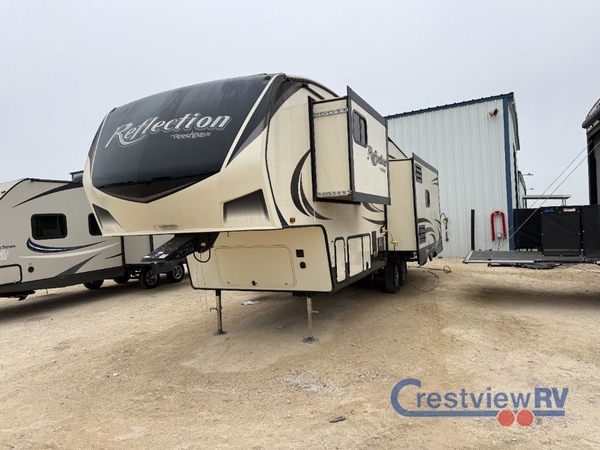 You will enjoy the comforts of home while on the road with this Reflection fifth wheel! It features a front private bedroom with a queen bed for you to enjoy a good night's rest, under the bed storage, and closets/drawers for you to keep all of your clothes neat and tidy. After an adventurous day, you can head to the rear living area where you will have your choice to relax on either the tri-fold sofa or the theater seats while you watch your favorite movie on the 40" TV or enjoy a cozy fire in the fireplace. The kitchen has everything you will need to whip up your best meals including a kitchen island with a large sink to make your clean up a breeze. Don't forget about storing your camp chairs and golf clubs in the exterior unobstructed pass-through compartment too. This model has many more standard features to enjoy and options to choose from, come see today!