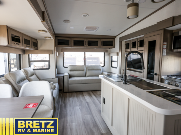 Whether you travel for pleasure or work, you will love the spacious main living and kitchen area with a rear tri-fold sofa that doubles as extra sleeping space, and the theater seating directly across from the entertainment center with a 40" LED HDTV and a fireplace below. The kitchen island will make meal prepping and drying the dishes easier and the hutch is the perfect place to place your picture frames, nice dishes, and extra cooking items. There is even a pantry that is big enough to store all of your favorite snacks, dry ingredients and such. Outside you can enjoy two electric awnings that provide protection from the elements as you relax and visit with other RVers, and your camping chairs can easily be stored in the pass-through compartment. The double entry bathroom is convenient especially at night when you can slide the door to enter from the front master bedroom. You will find plenty of storage for your clothing and gear, plus the bedroom slide out gives you drawers and linen storage that stretches into the full bathroom.