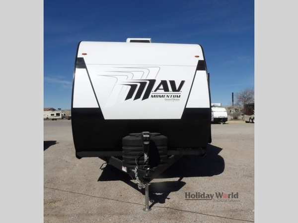 The Momentum MAV toy hauler travel trailers by Grand Design are designed to provide exactly what you need. The spacious garage provides tons of cargo space, with no wheel wells to get in the way. Additional storage includes magnetic storage door catches, and overhead consoles throughout. Conveniences like motion sensor lights and USB outlets will make your life easier, and you will be comfortable in all seasons with the 30K BTU furnace plus 15K BTU ducted air conditioning. The standard Solar Package comes with a 180W solar panel, a 40 Amp charge controller with Bluetooth, and a 12V refrigerator so you can go off-grid when the adventure calls for it.