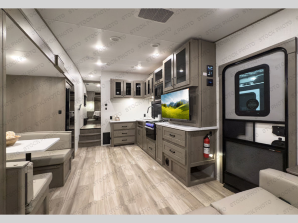 This is the perfect couple's trailer with a space for an overnight guest or two little ones on the booth dinette. You can switch out this dinette for an optional swivel dinette as well, and the standard theater seating can be replaced by an optional trundle bed if you need more sleeping space. A 40" HDTV will keep you entertained when the weather isn't cooperating, and you can whip up your best meals in the full kitchen. And a 19' power awning will provide shade if you choose to take your plate outdoors! The spacious full bath will let you clean up each day, and you'll feel right at home in the front private bedroom with a queen bed!
