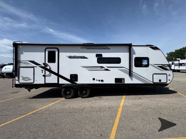With any Jay Feather travel trailer by Jayco, you will enjoy lightweight towing, convenient exterior amenities, and at-home comforts inside! The Overlander 1 Solar Package included within the Jay Sport Package comes with a 200W solar panel and a 30-amp digital controller so you can enjoy some off-grid camping. There is also a modern graphics package with a dual-colored sidewall, LCI Solid Step fold-down aluminum tread steps on the main entry door, and Climate Shield 0 -100° F tested weather insulation package that will allow you to camp in all sorts of climates. The Customer Value Package will make time outdoors easier than ever with a power tongue jack and a Rock Solid stabilizer system, plus American-made nitro-filled Goodyear tires with self-adjusting electric brakes. More exterior features include a Keyed-Alike locking system, marine grade exterior speakers, a Magnum Truss roof system, and the list goes on! And we haven't even touched on the interior comforts, like the residential style seamless countertops and vinyl flooring throughout, decorative backsplash, handcrafted hardwood door/drawer fronts, and multiple USB charging ports to keep you going!