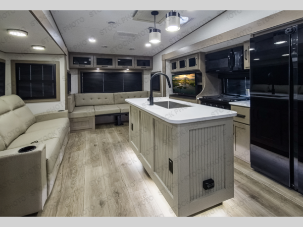 When you are looking for a versatile extra room for either a second bedroom or living area as well as an office, this middle bunkhouse might just work! There is a slide out with two bunks and drawers plus a dresser. You can sleep like royalty on the walk-around queen bed in the front private bedroom that offers more clothing storage and windows for views. The rear main living and kitchen area provides plenty of seating on the 78" theater seats, and on the 92" U-shaped lounge. The kitchen island gives the cook more space to make and serve meals, and the gourmet kitchen includes a 16-cu. ft. refrigerator, plus a pantry for dry goods. There is an exterior outside kitchen with a griddle and a 1.6 cu. ft. refrigerator for beverages and such, plus you will find an LP quick connect, Coax TV hookup, and a spray port to wash off your dirty shoes.