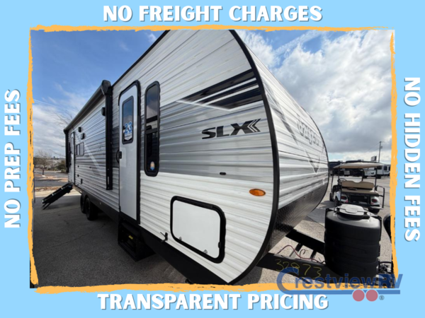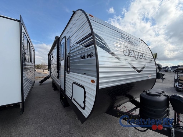 The Jayco Jay Flight SLX travel trailer is quite easy to own because it is lightweight for an easier towing experience. Built on a fully integrated A-frame with galvanized-steel, impact-resistant wheel wells, the Jay Flight SLX has quality at its very foundation. That quality continues on to the electric self-adjusting brakes, easy-lube hubs, Magnum Truss roof system, and LP quick connect. Some of what the mandatory Customer Value Package includes is backup camera prep, Keyed-Alike entry and baggage doors, and an on-demand tankless water heater.