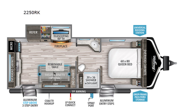 Enjoy your time with your spouse in this trailer that includes a master suite with a walk-around queen bed, dual wardrobes, a second exterior entry, and a sliding interior door for privacy. You can enter the walk-through bathroom through the bedroom or the main living and kitchen area after taking a shower with a skylight, and brushing your teeth by the sink with lots of counter space and storage for your toiletries. You can then relax at the dinette with reversible dinette cushions while watching the 40" telescoping TV or make a warm meal in the rear kitchen with a window for a great view. You might even like to add the optional theater dinette, the choice is yours. And the fireplace is another cozy feature within this combined living and kitchen area.