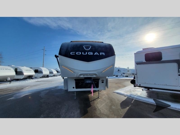 The Cougar Sport structural I-beam frame with stamped steel cross-members and outriggers, plus its AlphaPly roof membrane are what active RVers love about the construction of the Cougar line. The Cougar Sport models are no exception when it comes to a great package, as well as being smaller and lighter weight than their big brother Cougar models. A one-piece, heated and enclosed polypropylene underbelly will add protection against the elements, and the electric stabilizer jacks will provide more stability. On the inside, residential shaker style hardwood cabinet doors and decorative crown molding, plus seamless pressed countertops and an on-demand water heater will make your unit feel even more like home. You are also sure to appreciate the shiplap style decorative accent wall behind the bed, a porcelain foot flush toilet in the bathroom, plus residential kitchen hardware, and so much more.