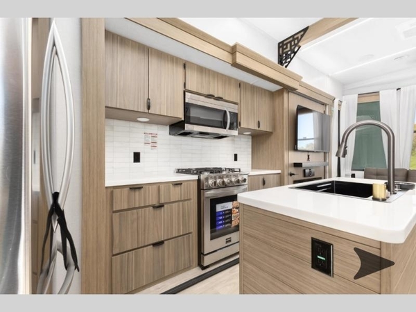 The grandkids will be begging to come along with you on your next getaway in this destination trailer! It features a double loft with three 42" x 74" bunk mats in total above the rear private bedroom. Inside the bedroom, you will find a king bed with Versa-Tilt slide and overhead cabinets, and a closet with optional washer/dryer prep if you want. The walk-in shower with a seat will make it easy for everyone to stay fresh and clean as well. The living and kitchen area feature a kitchen island, a free standing dinette to enjoy meals and play games at, a front sofa, and theater seating across from the entertainment center with a fireplace for those crisp evenings!