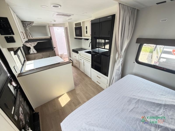 Camping trips are made complete in this travel trailer that can sleep seven each night! The little ones or your guest will love sleeping on the double-size bunks, while you take the queen bed in the front semi-private bedroom with a privacy curtain. A three-burner range and microwave oven will let you make meals each day, and a booth dinette provides a place to dine together. There are also convenient features found here, such as a pull-out pet dish and pull-out trash can, and there is ample storage space for your belongings. You will also appreciate the full bath that will let you stay clean throughout your trip without having to leave your trailer!
