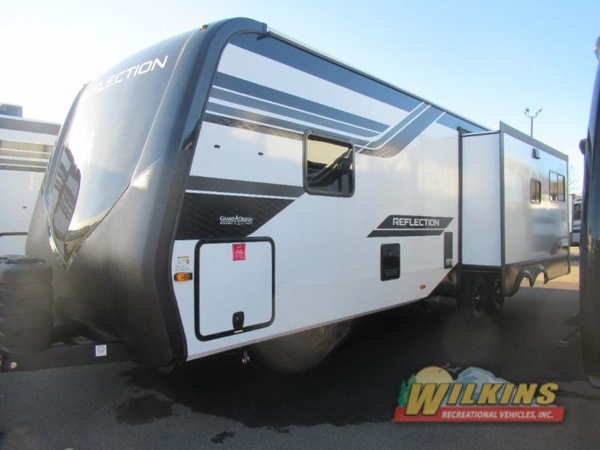 With any Reflection travel trailer by Grand Design, you will have a solar panel for off-grid camping and a 60 amp charge controller and inverter prep, a Universal All-In-One docking station, unobstructed pass-through storage, and Goodyear Endurance tires. Each is constructed of gel coat exterior sidewalls, residential 5" truss rafters, walk-on roof decking, a fiberglass and radiant foil roof and front cap insulation plus laminated aluminum framed side walls, roof and end walls in slide rooms. Head inside to enjoy residential hardwood cabinet doors, premium Congoleum flooring, a spacious shower with a glass door, and many more comforts!