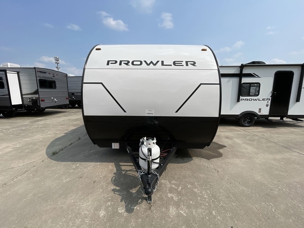 Get ready for comfortable and easy camping with the Prowler travel trailers by Heartland. The exterior features a power awning with LED lighting, stabilizer jacks, and diamond plate rock guard to help protect against rock and debris on the way to the campground. There is also a ladder and rear camera prep, an 8K roof mounted A/C, and a 20 lb. LP tank. Inside, you'll enjoy the dimmable LED ceiling lighting to keep your space well lit, and the on-demand water heater will provide endless hot showers.