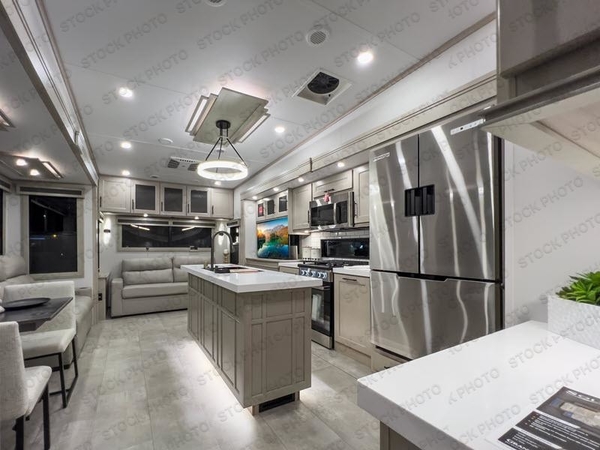 Are you looking to upgrade from a travel trailer to a fifth wheel? If so, this model will be perfect for you! Once you arrive at the campground, you can unload your gear from the pass-through storage, put out the two power awnings, then relax with a cold drink. Inside, you can kick your feet up on the theater seating, play a game at the free-standing dinette, or relax on the tri-fold sofa. The chef of your group will have a kitchen island with a Smart sink, dishwasher prep if you want the option to make cleaning up easier, plus a spacious 20 cu. ft. refrigerator. There is also a built-in oven, plus a pantry for storage galore! Having two bath sinks in the full bath is sure to be a big convenience when getting ready for bed, and the queen bed slide out in the front bedroom will provide a great night's rest. You will also find a front wardrobe, a slide top dresser, plus washer/dryer prep!
