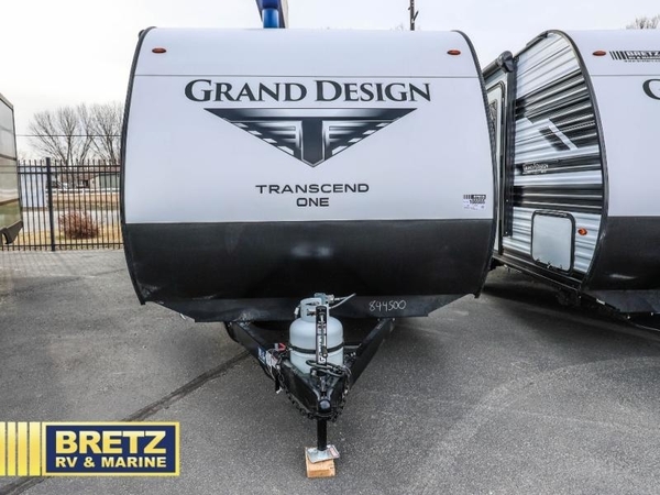 With any Transcend One travel trailer by Grand Design, you will enjoy lightweight towing thanks to their single axle. There are many interior comforts to make camping easier than ever, such as recessed lighting, residential countertops, and a 6' 6" interior height. Each model is constructed with a heated and enclosed underbelly with suspended tanks, a moisture barrier floor enclosure, and Thermofoil over the roof and front cap for added protection. And a JBL sound system will let you listen to tunes as you visit under the power awning with a Fusion light!