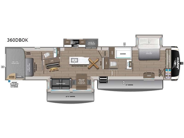 This fifth wheel is decked out in features you will love! The dual slides in the main living area create an open floorplan, and then there is a kitchen island that will make meal prepping easier. The theater seats plus roll tip dinette with chairs have a great view of the entertainment center and fireplace, and there is a ceiling fan here to keep the air moving. And did we mention there is an outside kitchen, complete with an outdoor refrigerator? This model also features a front private bedroom with a king bed slide out, a chest, and a front closet with convenient washer and dryer prep. There is also a rear private bunkhouse that has a 54" x 74" upper loft bed above a 66" x 80" Olympic bed with wardrobe storage drawers, as well as its very own half bathroom!