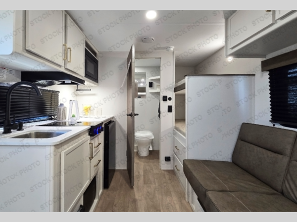 Camping trips to the lake have never been easier than with this travel trailer! The 28" x 67" bunks are right next to the private bath for easy nighttime use, and the front queen bed includes hidden storage for your things. There is also a 66" Jack knife sofa that provides a little more sleeping space for guests. A kitchen lets you cook meals each day and there is an exterior LP quick connect if you want to fire up your own propane grill.