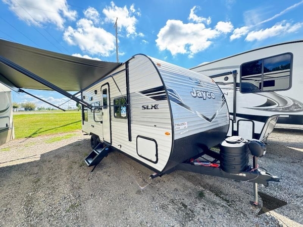 The Jayco Jay Flight SLX travel trailer is quite easy to own because it is lightweight for an easier towing experience. Built on a fully integrated A-frame with galvanized-steel, impact-resistant wheel wells, the Jay Flight SLX has quality at its very foundation. That quality continues on to the electric self-adjusting brakes, easy-lube hubs, Magnum Truss roof system, and LP quick connect. Some of what the mandatory Customer Value Package includes is backup camera prep, Keyed-Alike entry and baggage doors, and an on-demand tankless water heater.