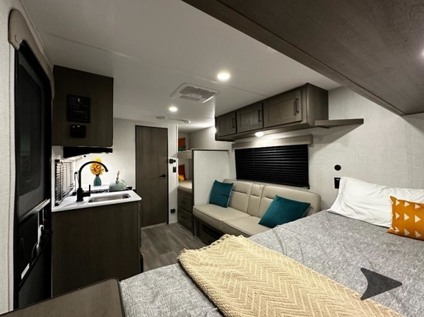 Camping trips to the lake have never been easier than with this travel trailer! The 28" x 67" bunks are right next to the private bath for easy nighttime use, and the front queen bed includes hidden storage for your things. There is also a 66" Jack knife sofa that provides a little more sleeping space for guests. A full kitchen lets you cook meals each day and there is an exterior LP quick connect if you want to fire up your own propane grill.