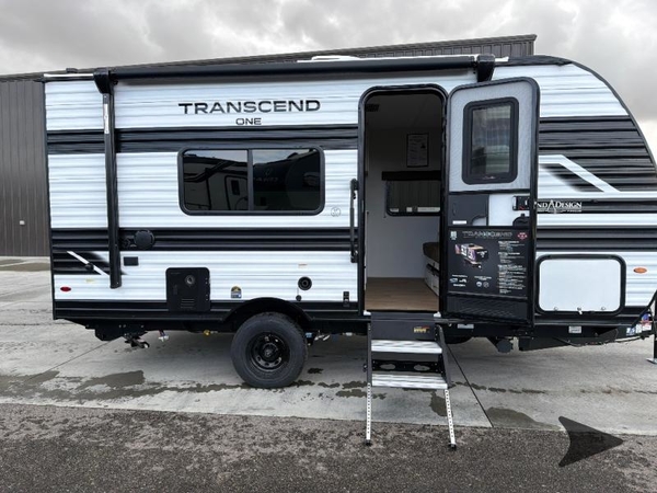 With any Transcend One travel trailer by Grand Design, you will enjoy lightweight towing thanks to their single-axle. There are many interior comforts to make camping easier than ever, such as recessed lighting, residential countertops, and a 6' 6" interior height. Each model is constructed with a heated and enclosed underbelly with suspended tanks, a moisture barrier floor enclosure, and Thermofoil over the roof and front cap for added protection. And a JBL sound system will let you listen to tunes as you visit under the power awning with a Fusion light!