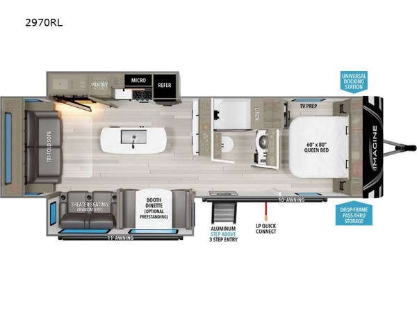 The Grand Design Imagine 2970RL is designed to elevate your camping experience with spacious interiors and premium amenities. Thanks to opposing slide-outs, youll enjoy an open-concept living area perfect for relaxing or entertaining. Unwind in the theater seating or tri-fold sofa while enjoying your favorite shows on the 40" LED HDTV with a cozy fireplace below.