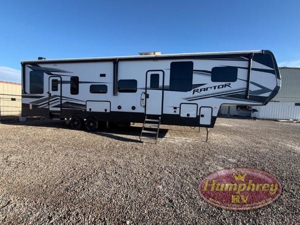 Experience a breath of fresh air with one of these Keystone RV Raptor fifth wheel toy haulers! Their rugged construction consists of a walkable one-piece Alpha Super Flex TPO roof with aluminum flashing, G-rated tires, Dyna Span floor decking, and 5,000 lb. frame-welded tie downs to keep your toys in place as you travel. With an on-demand water heater, you can have an endless amount of hot water when you need it. Some unexpected conveniences you will appreciate include an Omni-Chill A/C system to keep you cool on those hot summer days, a Furrion backup camera and HitchVision to prevent damages, and a Generation 3 iN-Command smart automation system with Global Connect to make life easier. Soft-close hardwood cabinetry makes for a quiet closure to enjoy undetected late night snacking, and the MORryde zero-gravity ramp door makes it easy to load and unload your toys. Come find the right one for you today!