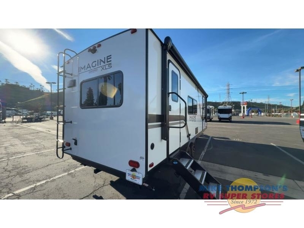 Treat yourself to a weekend of fun in this Imagine XLS travel trailer! Whether it's just you and your spouse, or you've chosen to bring along a group of friends, this trailer will meet your needs. The front bedroom can sleep two people on the walk-around queen-size bed. The bedroom is quite functional because it not only contains the second exterior entry door, but it also has a private entrance into the walk-through bathroom since it is located on the other side of the bathroom. The booth dinette is functional too because it can transform from a dining location into a sleeping location, and the theater seating is directly across from the LED TV for easy viewing. The rear kitchen is fit for the chef on the trip, it features residential countertops, a stainless-steel sink and a 3-burner range with oven for you to cook your meals in comfort.