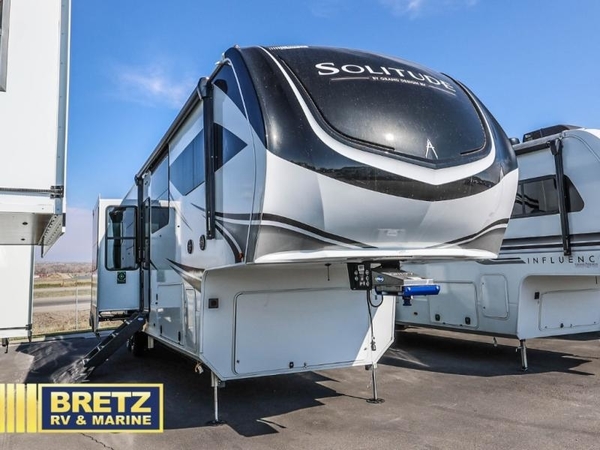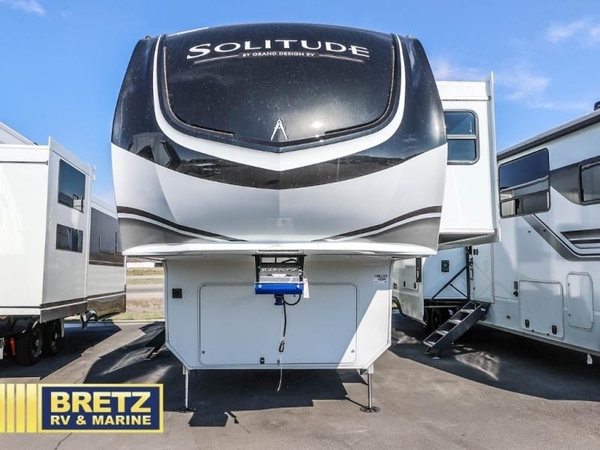 Each Solitude fifth wheel by Grand Design features a 101" wide-body construction, heavy duty 8,000 lb. axles, frameless tinted windows, and high-gloss gel coat sidewalls. You can camp during harsh weather thanks to the Weather-Tek Package that includes a 35K BTU high-capacity furnace, an all-in-one enclosed and heated utility center, and a fully enclosed underbelly with heated tanks and storage. Inside, you'll love the premium roller shades, hardwood cabinet doors, solid surface countertops, plus residential finishes throughout to make you truly feel at home. Each model also includes a MORryde CRE3000 suspension system, and a MORryde pin box that will provide smooth towing from home to campground. Affordable luxury is possible with the Solitude fifth wheels; choose yours today!