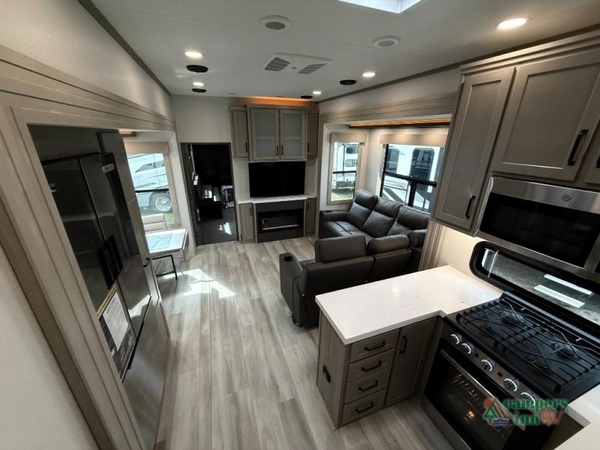 With any Momentum M-Class toy hauler by Grand Design, you will enjoy luxury at every turn! They have been constructed to a superior standard with a thermal roof design, triple insulated main floor and garage floor, and a Rail-Tite underbelly seal that will allow you to camp in all elements. Each model also features a, 8' 5" wide body chassis with a wide rail design, no wheel wheels, and a dovetail entry for easier loading. The Stealth A/C system provides maximum cooling power, and the CRE3000 suspension system means you can enjoy a smooth tow each time. You will love the luxurious interior with a professional grade stainless steel cooktop, interior color changing LED accent lighting, a fiberglass shower with a glass door, and solid surface countertops.