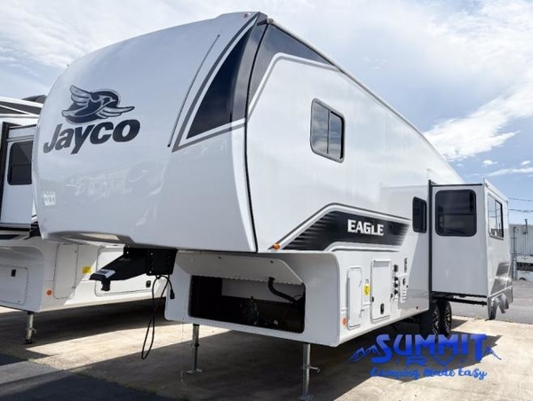 With any Eagle SLE fifth wheel by Jayco, you will enjoy a lighter tow weight, high-end finishes, and the same quality construction you've come to expect from Jayco! There is an Alpha Ply TPO roof membrane, a fully enclosed and heated underbelly, plus Stronghold VBL walls for added durability. There is also a rear 2" towing receiver outside, along with metal slam latch baggage doors, MORryde Step Above entry steps, and a Winegard Air 360 antenna with router prep if you want to stay connected as you camp. Once inside you'll enjoy the handcrafted door/drawer fronts, shower skylight, and residential vinyl flooring throughout with no carpet for an easier clean. The on-demand water heater, 30K BTU furnace, and 15K BTU "Whisper Quiet" A/C will ensure your comfort, and the Overland 1 Solar Package will provide off-grid capabilities!