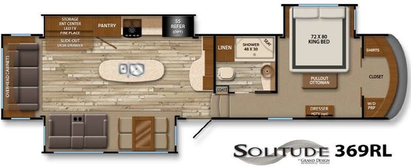 Enter this Solitude fifth wheel 369RL by Grand Design and be amazed at the wide open space you see with dual opposing slides in the combined kitchen and living area.