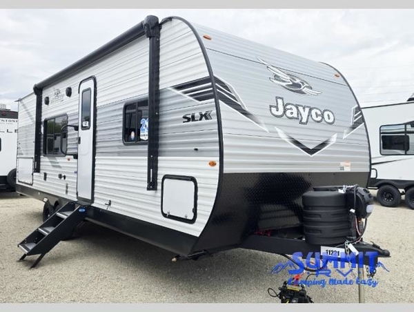 The Jayco Jay Flight SLX travel trailer is quite easy to own because it is lightweight for an easier towing experience. Built on a fully integrated A-frame with galvanized-steel, impact-resistant wheel wells, the Jay Flight SLX has quality at its very foundation. That quality continues on to the electric self-adjusting brakes, easy-lube hubs, Magnum Truss roof system, and LP quick connect. Some of what the mandatory Customer Value Package includes is backup camera prep, Keyed-Alike entry and baggage doors, and an on-demand tankless water heater.