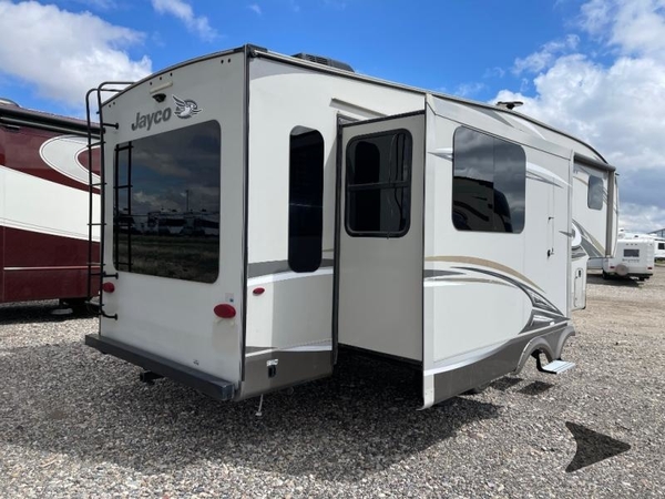 This Eagle HT 27.5RLTS fifth wheel by Jayco offers a rear living area plus plenty of room throughout with triple slide outs. In the kitchen there is a large counter area along the interior wall, and within the slide out you will find the appliances needed to prepare and store food from the three burner range to the 8 cu. ft. refrigerator. In the private front bedroom there is a queen bed with a Simmons mattress, and a slide out with storage. Outside you can enjoy the shade from the 14' electric awning with LED lights plus there is exterior storage for your extra camping gear and more!