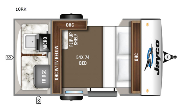This cute little Hummingbird travel trailer is the perfect couple's unit with its 54" x 74" bed and overhead cabinets for all your take-a-longs. You'll love the exterior kitchen that includes a 2-way refrigerator and 24" LED TV, a microwave, and a sink for easy clean-up. There are even two slide out drawers and a cabinet for extra storage. Enjoy easy, simple camping in this travel travel!