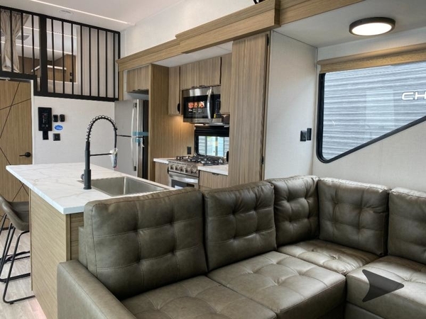 Stretch out, spread out, and basically move in. This destination trailer gives you a front and rear bedroom, each with a king-size bed so everyone gets a true residential sleep space, not just the primary occupants. Each bedroom is near its own full bathroom, making it perfect for couples traveling together, extended family, or long-term guests. In the middle, the living area centers around a spacious L-shaped sofa thats ideal for lounging, movie nights, or extra sleeping space when needed. The kitchen feels like home too, thanks to a generous kitchen island that adds prep space and storage, plus stainless steel appliances that look sharp and make everyday cooking feel easy and residential.
