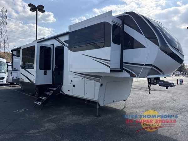 Five slide outs, a full bathroom with dual sinks, a half bath off of the kitchen, and a separate front living room and entertainment area are a few reasons you will enjoy your time spent in this fifth wheel! The separate kitchen is a dream with stainless steel appliances including a built-in oven, a pantry and hutch with counter space, a kitchen island plus a free-standing dinette slide with windows for great views. The entertainment center offers an LED Smart TV with a fireplace below and storage, and the dual opposing tri-fold sofas provide added sleeping space at night. The master bedroom includes a queen bed plus space savings sliding doors that lead you to the rear full bathroom with dual sinks, linen storage, and washer/dryer prep. The exterior has several storage choices as well including a pass-through storage compartment for fishing poles and such, plus the unique sliding tray in the rear allows you to bring along larger items such as camping tables, portable grills, golf clubs, totes and more.