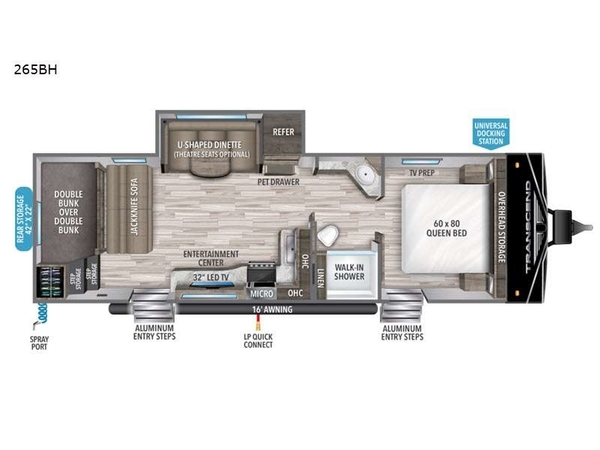 Are you ready to camp in comfort with your family or friends? This travel trailer allows you to do just that! There are double-size bunks in the back with two steps that have storage for books or board games. There is also a closet here to keep clothes wrinkle-free. The U-shaped dinette within the slide out can be switched out for the optional theatre seats, and the jackknife sofa will be the perfect spot to visit with your crew. This model features a walk-through bath that leads to the front master bedroom. You'll love the queen bed here, overhead storage, and your own exterior entry door for convenience.