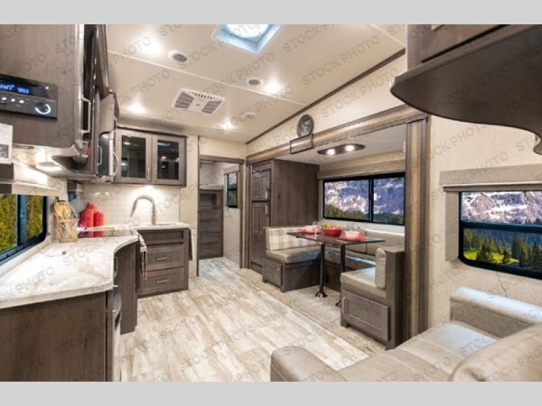 The heart of the RV is the open-concept living room and kitchen, designed for gathering, relaxing, and enjoying meals together. A large slide-out creates a roomy interior, while panoramic windows bring the outdoors inside. The comfortable seating area, entertainment center, and cozy fireplace make it easy to unwind after a day of adventure.