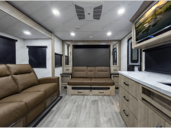 The Murphy bed is the eye-catching feature on this Imagine XLS travel trailer! Not only can it fold away in the morning to reveal a sofa for lounging, but it will also provide you with drawer storage under the sofa. Another functional feature is the theater dinette with a removable table in front, or you can choose the optional U-shaped dinette if you like to gather around for game night. It rests on the single slide so that there is more floor space, and it offers you great comfort while you dine across from the LED HDTV. A full bathroom will keep you clean and fresh with its residential walk-in shower, skylight, linen closet, vanity, toilet, and power vent fan.